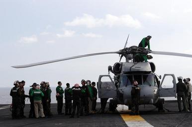 | Keywords: US Navy 080630-N-3659B-086 Flight deck personnel stand by as last minute maintenance is performed on an SH-60F Seahawk.jpg en SULU SEA June 30 2008 Flight deck personnel stand by as last minute maintenance is performed on an SH-60F Seahawk assigned to the Black Knights of Helicopter Anti-Submarine Squadron HS 4 on the flight deck of the Nimitz-class aircraft carrier USS Ronald Reagan CVN 76 The Black Knights have been a key part of the recent relief efforts for the typhoon that struck the Republic of the Philippines moving both personnel and supplies wherever and whenever needed At the request of the government of the Republic of the Philippines Ronald Reagan is off the coast of Panay Island providing humanitarian assistance and disaster response in the wake of Typhoon Fengshen Ronald Reagan and other U S Navy ships are operating in the 7th Fleet area of responsibility to promote peace cooperation and stability U S Navy photo by Mass Communication Specialist 2nd Class Joseph M Buliavac Released 2008-06-30 080630-N-3659B-086 Navy http //www navy mil/view_image asp id 60880 U S Navy photo by Mass Communication Specialist 2nd Class Joseph M Buliavac PD-USGov-Military-Navy Helicopters at USS Ronald Reagan CVN-76 SH-60F Oceanhawk |