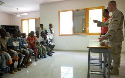 | Keywords: US Navy 080701-F-0986R-023 Cmdr. Michael Marks, a naval dentist with the Emergency Medical Unit at Camp Lemonier, Djibouti demonstrates to children the proper way to brush their teeth during a visit to a dental clinic in Djibou.jpg en DJIBOUTI CITY Djibouti July 1 2008 Cmdr Michael Marks a naval dentist with the Emergency Medical Unit at Camp Lemonier Djibouti demonstrates to children the proper way to brush their teeth during a visit to a dental clinic in Djibouti City Marks is assigned to Combined Joint Task Force Horn of Africa U S Air Force Photo by Staff Sgt Samuel Rogers Released 2008-07-01 080701-F-0986R-023 Navy http //www navy mil/view_image asp id 61008 U S Navy photo PD-USGov-Military-Navy Images from US Navy location Djibouti City Djibouti People with toothbrushes |