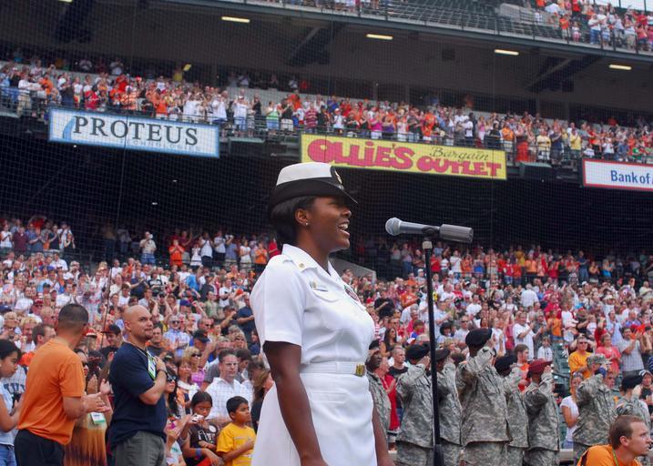 | Keywords: US Navy 080704-N-2257C-036 Chief Musician Yolanda Pelzer sings the national anthem.jpg en BALTIMORE Md July 4 2008 Chief Musician Yolanda Pelzer sings the national anthem to begin the Friday afternoon baseball game between the Baltimore Orioles and Texas Rangers as service members from Walter Reed National Medical Center render honors in the background U S Navy Photo by Musician 1st Class Shana E Catandella Released 2008-07-04 080704-N-2257C-036 Navy http //www navy mil/view_image asp id 61159 U S Navy Photo by Musician 1st Class Shana E Catandella PD-USGov-Military-Navy 2008 in Baltimore Images from US Navy location BALTIMORE Md Oriole Park at Camden Yards 2008 Baltimore Orioles season |