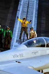 | Keywords: US Navy 080711-N-3659B-038 An Aviation Boatswain's Mate (Handling) directs an F-A-18F Super Hornet assigned to the.jpg en PACIFIC OCEAN July 11 2008 An Aviation Boatswain's Mate Handling directs an F/A-18F Super Hornet assigned to the Fighting Redcocks of Strike Fighter Squadron VFA 22 onto catapult one during flight operations aboard the Nimitz-class aircraft carrier USS Ronald Reagan CVN 76 The Ronald Reagan Carrier Strike Group is on a routine deployment in the U S 7th Fleet area of responsibility in the western Pacific and Indian oceans U S Navy photo by Mass Communication Specialist 2nd Class Joseph M Buliavac Released 2008-07-11 080711-N-3659B-038 Navy http //www navy mil/view_image asp id 61292 U S Navy photo by Mass Communication Specialist 2nd Class Joseph M Buliavac PD-USGov-Military-Navy Aviation Boatswain's Mates Handlers Flight deck of USS Ronald Reagan CVN-76 Steam catapults Strike Fighter Squadron 22 United States Navy |