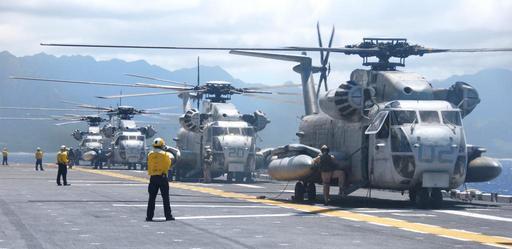 | Keywords: US Navy 080726-N-9493W-062 Four landing signal enlisted prepare to launch CH-53D Sea Stallions from the flight deck of the amphibious assault ship USS Bonhomme Richard (LHD 6).jpg en PACIFIC OCEAN July 26 2008 Four landing signal enlisted prepare to launch CH-53D Sea Stallions assigned to Heavy Marine Helicopter Squadron HMH 362 from the flight deck of the amphibious assault ship USS Bonhomme Richard LHD 6 during flight operations Bonhomme Richard is participating in Rim of the Pacific 2008 U S Navy photo by Mass Communication Specialist 2nd Class Justin Webb/Released 2008-07-26 080726-N-9493W-062 Navy http //www navy mil/view_image asp id 61908 U S Navy photo by Mass Communication Specialist 2nd Class Justin Webb PD-USGov-Military-Navy Marine Heavy Helicopter Squadron 362 Sikorsky CH-53A/D Sea Stallion U S Marine Corps Aboard USS Bonhomme Richard LHD-6 Taken with Nikon D200 |