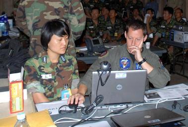 | Keywords: US Navy 080821-N-1083F-001 Lt. Jeff Bowman works alongside a Republic of Korea counterpart.jpg en BUSAN Republic of Korea Aug 21 2008 Lt Jeff Bowman commander U S 7th Fleet planner works alongside a Republic of Korea counterpart during the final stages of exercise Ulchi Freedom Guardian UFG 08 The amphibious command ship USS Blue Ridge LCC 19 and embarked U S 7th Fleet Staff are in Busan participating in UFG an exercise designed to evaluate and improve combined and joint coordinating procedures plans and systems for conducting operations between the Republic of Korea and U S forces U S Navy photo by Mass Communication Specialist 1st Class Ben Farone/Released 2008-08-21 080821-N-1083F-001 Navy http //www navy mil/view_image asp id 62993 U S Navy photo by Mass Communication Specialist 1st Class Ben Farone PD-USGov-Military-Navy Images from US Navy location BUSAN Korea Aboard USS Blue Ridge LCC-19 Ulchi Freedom Guardian 2008 |