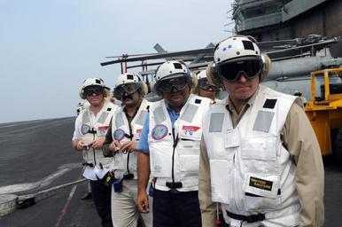 | Keywords: US Navy 081021-N-3659B-260 Rear Adm. Phillip J. Wisecup and Rear Adm. Anil Chopra watch flight operations on the flight deck of the Nimitz-class aircraft carrier USS Ronald Reagan (CVN 76).jpg en INDIAN OCEAN Oct 21 2008 Rear Adm Phillip J Wisecup commander Carrier Strike Group 7 and Rear Adm Anil Chopra flag officer commanding Western Fleet of the Indian navy watch flight operations on the flight deck of the Nimitz-class aircraft carrier USS Ronald Reagan CVN 76 Chopra visited Ronald Reagan as part of exercise Malabar 08 Malabar is designed to increase cooperation between the Indian and U S Navy while enhancing the cooperative security relationship between India and the U S U S Navy photo by Mass Communication Specialist 2nd Class Joseph M Buliavac/Released 2008-10-21 081021-N-3659B-260 Navy http //www navy mil/view_image asp id 65614 U S Navy photo by Mass Communication Specialist 2nd Class Joseph M Buliavac PD-USGov-Military-Navy Malabar 2008 Guests aboard USS Ronald Reagan CVN-76 James P Wisecup People of the Indian Navy Anil Chopra admiral |