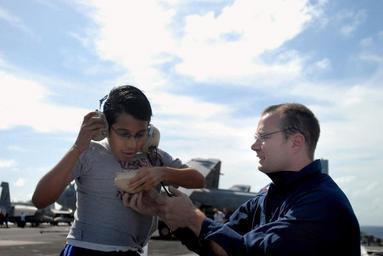 | Keywords: US Navy 081119-N-3610L-021 Interior Communications (Electrician) 2nd Class Clinton Adams explains how to use a sound powered phone.jpg en PACIFIC OCEAN Nov 19 2008 Interior Communications Electrician 2nd Class Clinton Adams explains how to use a sound powered phone to Mahesh Shawwhile standing watch on the flight deck of the Nimitz-class aircraft carrier USS Ronald Reagan CVN 76 during a Tiger Cruise Ronald Reagan embarked 1 200 guests for the Tiger Cruise Ronald Reagan is on a routine deployment currently operations in the 3rd Fleet area of responsibility U S Navy photo by Mass Communication Specialist 3rd Class Torrey W Lee/Released 2008-11-19 081119-N-3610L-021 Navy http //www navy mil/view_image asp id 66741 U S Navy photo by Mass Communication Specialist 3rd Class Torrey W Lee PD-USGov-Military-Navy Guests aboard USS Ronald Reagan CVN-76 Interior Communications Electrician People of the United States Navy with sound-powered telephones |