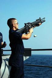 | Keywords: US Navy 081128-N-7239B-003 Gunner's Mate 3rd Class Edwin Finn ejects the spent shell from a M203 barrel.jpg en GULF OF OMAN Nov 28 2008 Gunner's Mate 3rd Class Edwin Finn ejects the spent shell from a M203 barrel after launching a grenade from the fantail aboard the Nimitz-class aircraft carrier USS Theodore Roosevelt CVN 71 Theodore Roosevelt and embarked Carrier Air Wing CVW 8 are on deployment in the U S 5th Fleet area of responsibility and are focused on reassuring regional partners of the United States' commitment to security which promotes stability and global prosperity U S Navy photo by Mass Communication Specialist 3rd Class Kellie Bliss/Released 2008-11-28 081128-N-7239B-003 Navy http //www navy mil/view_image asp id 67041 U S Navy photo by Mass Communication Specialist 3rd Class Kellie Bliss PD-USGov-Military-Navy M16 rifle with M203 Males with M203 Aboard USS Theodore Roosevelt CVN-71 Gunner's Mate Cartridge ejection |