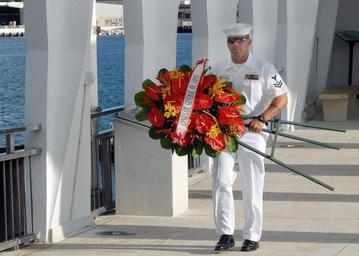 | Keywords: US Navy 081206-N-4512B-182 Boatswain's Mate 2nd Class Arthur Sacdana prepares a wreath for display during Pearl Harbor Day events.jpg en PEARL HARBOR Dec 6 2008 Boatswain's Mate 2nd Class Arthur Sacdana prepares a wreath donated by the Consulate General of Japan for display during upcoming Pearl Harbor Day events aboard the USS Arizona Memorial The wreaths serve as a tribute to service members killed during the Dec 7 1941 attack on Pearl Harbor The theme of this year's historic commemoration Pacific War Memories The Heroic Response to Pearl Harbor emphasized the brave efforts of those who fought at sea on land and in the air to turn the tide in the Pacific More than 2 000 guests and the general public joined service members Pearl Harbor survivors and their families and friends for the annual observance U S Navy photo by Mass Communication Specialist 3rd Class Jeremy S Brandt/Released 2008-12-06 081206-N-4512B-182 Navy http //www navy mil/view_image asp id 67202 U S Navy photo by Mass Communication Specialist 3rd Class Jeremy S Brandt PD-USGov-Military-Navy USS Arizona Memorial interior Boatswain's Mate United States Navy Memorial wreaths |