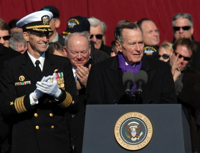 Keywords: US Navy 090110-N-4408B-416 Former President George H.W. Bush receives a standing ovation before delivering his keynote address at the commissioning ceremony for the aircraft carrier USS George H.W. Bush (CVN 77) at Naval Statio.jpg en NORFOLK Jan 10 2009 Former President George H W Bush receives a standing ovation before delivering his keynote address at the commissioning ceremony for the aircraft carrier USS George H W Bush CVN 77 at Naval Station Norfolk Va Bush delivered the keynote address at the commissioning The Navy's newest and final Nimitz-class aircraft carrier is named after the World War II naval aviator and 41st president of the United States U S Navy photo by Mass Communication Specialist 3rd Class Micah P Blechner/Released 2009-01-10 090110-N-4408B-416 Navy http //www navy mil/view_image asp id 67818 U S Navy photo by Mass Communication Specialist 3rd Class Micah P Blechner PD-USGov-Military-Navy Commissioning of USS George H W Bush CVN-77 |