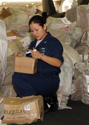 | Keywords: US Navy 090127-N-2562S-005 Interior Communications Electrician 3rd Class Erica Tapia assists in sorting mail during a mail working party aboard the aircraft carrier USS Theodore Roosevelt (CVN 71).jpg en AT SEA Jan 27 2009 Interior Communications Electrician 3rd Class Erica Tapia assists in sorting mail during a mail working party aboard the aircraft carrier USS Theodore Roosevelt CVN 71 Theodore Roosevelt and Carrier Air Wing CVW 8 are conducting operations in the U S 5th Fleet area of responsibility U S Navy photo by Mass Communication Specialist Seaman Apprentice Andrew Skipworth/Released 2009-01-27 090127-N-2562S-005 Navy http //www navy mil/view_image asp id 68368 U S Navy photo by Mass Communication Specialist Seaman Apprentice Andrew Skipworth PD-USGov-Military-Navy Images from US Navy location AT SEA Interior Communications Electrician |