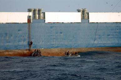 | Keywords: US Navy 090206-N-3931M-012 Sailors from the Norfolk-based destroyer USS Mason (DDG 87) climb aboard Motor Vessel Faina to conduct a health and comfort inspection of the crew as well as provide them with food, water and medical.jpg en SOMALIA Feb 6 2009 Sailors from the Norfolk-based destroyer USS Mason DDG 87 climb aboard Motor Vessel Faina to conduct a health and comfort inspection of the crew as well as provide them with food water and medical support Somali pirates released the Motor Vessel Faina Feb 5 after holding it for more than four months The U S Navy has remained within visual range of the ship and maintained a 24-hour 7-days a week presence since it was captured The Belize-flagged cargo ship is owned and operated by Kaalbye Shipping Ukraine and is carrying a cargo of Ukrainian T-72 tanks and related equipment The ship was attacked on Sept 25 and forced to proceed to anchorage off the Somali Coast U S 5th Fleet conducts maritime security operations to promote stability and regional economic prosperity U S Navy photo by Mass Communication Specialist 1st Class Michael R McCormick/Released 2009-02-06 090206-N-3931M-012 Navy http //www navy mil/view_image asp id 68587 U S Navy photo by Mass Communication Specialist 1st Class Michael R McCormick PD-USGov-Military-Navy Faina ship 1978 Combined Task Force 151 |