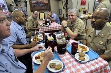 | Keywords: US Navy 090219-N-8273J-162 Chief of Naval Operations Adm. Gary Roughead has lunch with Missile Technician 2nd Class Matthew Edlin, Electronics Technician 1st Class Sterling Sims, and Cmdr. Roger Isom.jpg en KINGS BAY Ga Feb 19 2009 Chief of Naval Operations CNO Adm Gary Roughead has lunch with Missile Technician 2nd Class Matthew Edlin left Electronics Technician 1st Class Sterling Sims and Cmdr Roger Isom commanding officer of the Gold crew of the ballistic-missile submarine USS Wyoming SSBN 742 Roughead is in Naval Region Southeast to attend the commemoration ceremony for the 1000th Trident patrol and to visit various naval facilities to get a first-hand look at the work being done by Sailors and Navy civilians in the region U S Navy photo by Mass Communication Specialist 1st Class Tiffini M Jones/Released 2009-02-19 090219-N-8273J-162 Navy http //www navy mil/view_image asp id 68963 U S Navy photo by Mass Communication Specialist 1st Class Tiffini M Jones PD-USGov-Military-Navy Gary Roughead in 2009 Naval Submarine Base Kings Bay USS Wyoming SSBN-742 Missile Technician |