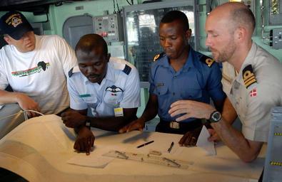 | Keywords: US Navy 090227-N-1688B-025 Royal Danish Navy Lt. Cmdr. Daniel Christensen, right, gives navigation training to Ghanaian Naval and Air Force officers aboard the amphibious transport dock ship USS Nashville (LPD 13).jpg en SEKONDI Ghana Feb 27 2009 Royal Danish Navy Lt Cmdr Daniel Christensen right gives navigation training to Ghanaian Naval and Air Force officers aboard the amphibious transport dock ship USS Nashville LPD 13 Nashville is on a scheduled 18-day Africa Partnership Station training visit to Sekondi Naval Base in Ghana Africa Partnership Station is an international initiative developed by Naval Forces Europe and Naval Forces Africa to work cooperatively with U S and international partners to improve maritime safety and security on the African continent U S Navy photo by Mass Communication Specialist 3rd Class Matthew Bookwalter/Released 2009-02-27 090227-N-1688B-025 Navy http //www navy mil/view_image asp id 69315 U S Navy photo by Mass Communication Specialist 3rd Class Matthew Bookwalter PD-USGov-Military-Navy United States Navy in Ghana 2009 Aboard USS Nashville LPD-13 United States Navy in Sekondi-Takoradi Military people of Ghana Africa Partnership Station 2009 |