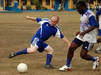 | Keywords: US Navy 090227-N-1655H-009 Boatswain's Mate 3rd Class Joseph Kluempers, assigned to the amphibious transport dock ship USS Nashville (LPD 13), left, makes a move on a Ghanaian Navy defender.jpg en SEKONDI Ghana Feb 27 2009 Boatswain's Mate 3rd Class Joseph Kluempers assigned to the amphibious transport dock ship USS Nashville LPD 13 left makes a move on a Ghanaian Navy defender during an Africa Partnership Station goodwill soccer game between the two services Africa Partnership Station is an international initiative developed by Naval Forces Europe and Naval Forces Africa to work cooperatively with U S and international partners to improve maritime safety and security on the African continent U S Navy photo by Mass Communication Specialist 3rd Class Matthew Bookwalter/Released 2009-02-27 090227-N-1655H-009 Navy http //www navy mil/view_image asp id 69318 U S Navy photo by Mass Communication Specialist 3rd Class Matthew Bookwalter PD-USGov-Military-Navy United States Navy in Ghana 2009 Aboard USS Nashville LPD-13 United States Navy in Sekondi-Takoradi Africa Partnership Station 2009 |
