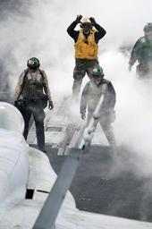 | Keywords: US Navy 090320-N-3659B-067 Aviation Boatswain's Mate (Handling) Airman Daryl Cobb uses hand signals to tell the pilot of an F-A-18C Hornet to move the aircraft forward onto catapult one.jpg en PACIFIC OCEAN March 20 2009 Aviation Boatswain's Mate Handling Airman Daryl Cobb uses hand signals to tell the pilot of an F/A-18C Hornet to move the aircraft forward onto catapult one of the Nimitz-class aircraft carrier USS Ronald Reagan CVN 76 Cobb is under instruction as a flight deck plane handler training for his final qualification to direct personnel and aircraft on the flight deck Ronald Reagan and Carrier Air Wing CVW 14 are underway conducting a sustainment exercise in the Pacific Ocean U S Navy photo by Mass Communication Specialist 2nd Class Joseph M Buliavac/Released 2009-03-20 090320-N-3659B-067 Navy http //www navy mil/view_image asp id 69937 U S Navy photo by Mass Communication Specialist 2nd Class Joseph M Buliavac PD-USGov-Military-Navy Aviation Boatswain's Mates Catapults of USS Ronald Reagan CVN-76 F/A-18 Hornet launches from USS Ronald Reagan CVN-76 |