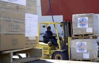| Keywords: US Navy 090324-F-7923S-014 Crews load 175-pound pallets of medical supplies and personal hygiene items donated to Project Handclasp aboard the Military Sealift Command hospital ship USNS Comfort (T-AH 20).jpg en NORFOLK Va March 24 2009 Crews load 175-pound pallets of medical supplies and personal hygiene items donated to Project Handclasp aboard the Military Sealift Command hospital ship USNS Comfort T-AH 20 The donations will be distributed by Sailors aboard Comfort to people in Central and South America and the Caribbean during Continuing Promise 2009 a humanitarian assistance mission in the U S Southern Command area of responsibility Comfort is scheduled to depart Norfolk on April 1 for the four-month deployment U S Air Force photo by Airman 1st Class Benjamin Stratton/Released 2009-03-24 090324-F-7923S-014 Navy http //www navy mil/view_image asp id 70048 U S Air Force photo by Airman 1st Class Benjamin Stratton PD-USGov-Military-Navy Naval Station Norfolk Personal hygiene items Project Handclasp United States Navy |