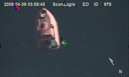 | Keywords: US Navy 090409-N-0000X-934 In a still frame from video taken by the Scan Eagle unmanned aerial vehicle, a 28-foot lifeboat from the U.S.-flagged container ship Maersk Alabama is seen Thursday, April 9, 2009 in the Indian Ocean.jpg en INDIAN OCEAN April 9 2009 In a still frame from video taken by the Scan Eagle unmanned aerial vehicle a 28-foot lifeboat from the U S -flagged container ship Maersk Alabama is seen Thursday April 9 2009 in the Indian Ocean U S Navy Photo 2009-04-09 090409-N-0000X-934 Navy http //www navy mil/view_image asp id 70464 U S Navy photo PD-USGov-Military-Navy Indian Ocean Maersk Alabama lifeboat Still images from videos Photos and video from unmanned aerial vehicles |