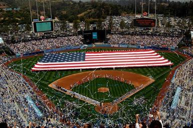| Keywords: US Navy 090413-N-9706M-124 Sailors and Marines unfurl a football field-sized American flag at Dodger Stadium during the pre-game activities before a Major League Baseball game between the Los Angeles Dodgers and the San Francis.jpg en LOS ANGELES April 14 2009 Sailors and Marines unfurl a football field-sized American flag at Dodger Stadium during the pre-game activities before a Major League Baseball game between the Los Angeles Dodgers and the San Francisco Giants U S Navy photo by Mass Communication Specialist 1st Class David McKee/Released 2009-04-14 090413-N-9706M-124 Navy http //www navy mil/view_image asp id 70543 U S Navy photo by Mass Communication Specialist 1st Class David McKee PD-USGov-Military-Navy Dodger Stadium 2009 Los Angeles Dodgers season |