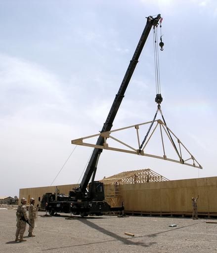 Keywords: US Navy 090417-N-9599T-027 Seabees use a crane to place trusses on a Southwest Asia hut during a project at forward operating base Leatherneck.jpg en HELMAND PROVINCE Afghanistan April 17 2009 Seabees assigned to Alfa Company Naval Mobile Construction Battalion NMCB 5 use a crane to place trusses on a Southwest Asia hut during a project at forward operating base Leatherneck NMCB-5 is deployed to Afghanistan supporting the NATO International Security Assistance Force NMCB-5 is one of the Naval Expeditionary Combat Command warfighting support elements providing host nation construction support and security U S Navy photo by Lt Michael Tomsik/Released 2009-04-17 090417-N-9599T-027 Navy http //www navy mil/view_image asp id 70818 U S Navy photo by Lt Michael Tomsik PD-USGov-Military-Navy Helmand Province in the War in Afghanistan 2001-present Timber construction Naval Mobile Construction Battalion 5 Mobile cranes |