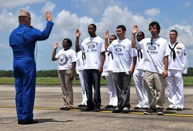 NEW ORLEANS (May 2, 2009) Lt. Manuel Sanchez, a maintenance officer assigned to the Blue Angels, administers the oath of enlistment to delayed entry program recruits from the New Orleans area during the N’Awlins Air Show at Naval Air Station Joint Reserve Base New Orleans. The three-day event featured the Blue Angels and attracted about 152,000 people. (U.S. Navy photo by Mass Communications Specialist 2nd Class John P. Curtis/Released)