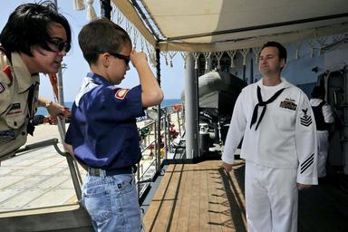| Keywords: US Navy 090503-N-7478G-051 A Cub Scout from Boy Scout Pack 112 from Camp Foster, Okinawa salutes Interior Communications Electrician 1st Class Jon Forrer as he comes aboard the amphibious command ship USS Blue Ridge (LCC 19).jpg en OKINAWA Japan May 3 2009 A Cub Scout from Boy Scout Pack 112 from Camp Foster Okinawa salutes Interior Communications Electrician 1st Class Jon Forrer as he comes aboard the amphibious command ship USS Blue Ridge LCC 19 for a ship's tour U S Navy photo by Mass Communication Specialist 2nd Class Cynthia Griggs/Released 2009-05-03 090503-N-7478G-051 Navy http //www navy mil/view_image asp id 71218 U S Navy photo by Mass Communication Specialist 2nd Class Cynthia Griggs x100px PD-USGov-Military-Navy Aboard USS Blue Ridge LCC-19 Images from US Navy location Okinawa Japan Interior Communications Electrician Cub Scouting Boy Scouts of America American Scouting overseas |