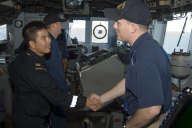 | Keywords: US Navy 090516-N-0743B-053 Capt. Chang Jun Tao, assigned to the Republic of Singapore Navy amphibious ship RSS Persistence (LPDM 209), meets Officer of the Deck Lt. j.g. Dennis Panos aboard the guided-missile cruiser USS Gettys.jpg en GULF OF ADEN May 17 2009 Capt Chang Jun Tao assigned to the Republic of Singapore Navy amphibious ship RSS Persistence LPDM 209 meets Officer of the Deck Lt j g Dennis Panos aboard the guided-missile cruiser USS Gettysburg CG 64 Gettysburg and Persistence are part of Combined Task Force 151 CTF 151 is a multinational task force established to conduct counter-piracy operations under a mission-based mandate throughout the Combined Maritime Forces' area of responsibility to actively deter disrupt and suppress piracy U S Navy photo by Mass Communication Specialist First Class Eric L Beauregard/Released 2009-05-17 090516-N-0743B-053 Navy http //www navy mil/view_image asp id 71831 U S Navy photo by Mass Communication Specialist First Class Eric L Beauregard PD-USGov-Military-Navy Aboard USS Gettysburg CG-64 |
