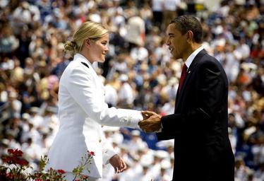ANNAPOLIS, Md. (May 22, 2009) U.S. President Barack Obama congratulates Navy ensign Katherine Besser during the U.S. Naval Academy Class of 2009 graduation and commissioning ceremony at Navy-Marine Corps Memorial Stadium. (U.S. Navy photo by Mass Communication Specialist 2nd Class Kevin S. O’Brien/Released)