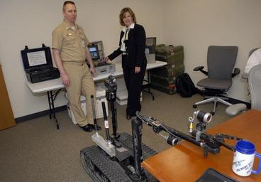 | Keywords: US Navy 090528-N-7676W-062 Master Chief Steve French and Laura Smith operate a Talon EOD robot during an Office of Naval Research Technical Solutions demonstration of the recently completed battery replacement project.jpg en ARLINGTON Va May 28 2009 Master Chief Steve French and Laura Smith operate a Talon EOD robot during an Office of Naval Research Technical Solutions demonstration of the recently completed battery replacement project The battery replacement project was prompted by a request from the II Marine Expeditionary Force 8th Engineering Battalion and resulted in a solution provided by Penn State University's Applied Research Laboratory that utilizes standard military batteries U S Navy photo by John F Williams/Released 2009-05-28 090528-N-7676W-062 Navy http //www navy mil/view_image asp id 72365 U S Navy photo by John F Williams PD-USGov-Military-Navy Arlington County Virginia |