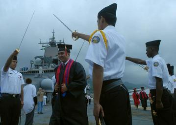 | Keywords: US Navy 090606-N-9950J-080 Graduate Anthony Ryan walks through the E.J. King High School.jpg en SASEBO Japan June 6 2009 Graduate Anthony Ryan walks through the E J King High School Naval Junior Reserve Officer's Training Corps NROTC Honor Guard during the 2009 E J King High School graduation ceremony aboard the forward-deployed amphibious assault ship USS Essex LHD 2 Essex is commanded by Capt Brent Canady and is the lead ship of the only forward-deployed U S Expeditionary Strike Group and serves as the flagship for CTF 76 the Navy's only forward-deployed amphibious force commander Task Force 76 is headquartered at White Beach Naval Facility Okinawa Japan with a detachment in Sasebo Japan U S Navy photo by Mass Communication Specialist 2nd Class Greg Johnson/Released 2009-06-06 090606-N-9950J-080 Navy http //www navy mil/view_image asp id 72456 U S Navy photo by Mass Communication Specialist 2nd Class Greg Johnson PD-USGov-Military-Navy Sasebo Nagasaki Aboard USS Essex LHD-2 Naval Reserve Officers Training Corps |