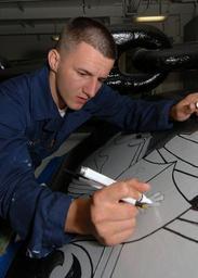 | Keywords: US Navy 090612-N-4408B-036 Seaman Jonathan Robles of USS George H.W. Bush (CVN 77) Deck Department fills in details on a painting of the Enlisted Surface Warfare Specialist pin in the ship's forecastle.jpg en ATLANTIC OCEAN June 12 2009 Seaman Jonathan Robles of USS George H W Bush CVN 77 Deck Department fills in details on a painting of the Enlisted Surface Warfare Specialist pin in the ship's forecastle His paintings are the center piece of USS Bush Deck Department's Forecastle Beautification project U S Navy photo by Mass Communication Specialist 3rd Class Micah P Blechner/Released 2009-06-12 090612-N-4408B-036 Navy http //www navy mil/view_image asp id 73141 U S Navy photo by Mass Communication Specialist 3rd Class Micah P Blechner PD-USGov-Military-Navy Aboard USS George H W Bush CVN-77 |