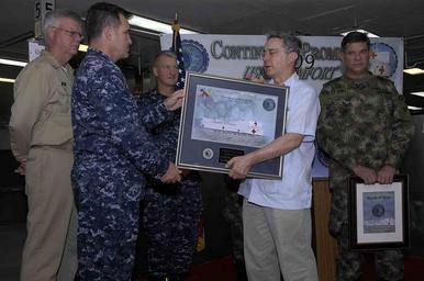 | Keywords: US Navy 090613-F-7923S-033 Colombian President Alvaro Uribe Velez, is presented with a gift from Capt. Bob Lineberry, mission commander of Continuing Promise 2009, aboard the Military Sealift Command hospital ship USNS Comfort.jpg en TUMACO Colombia June 13 2009 Colombian President Alvaro Uribe Velez is presented with a gift from Capt Bob Lineberry mission commander of Continuing Promise 2009 aboard the Military Sealift Command hospital ship USNS Comfort T- AH 20 Comfort is deployed on the four-month Continuing Promise 2009 humanitarian and civic assistance mission to Latin America and the Caribbean region Continuing Promise combines U S military and interagency personnel non-governmental organizations civil service mariners academic and partner nations to provide medical dental veterinary and engineering services afloat and ashore alongside host nation personnel U S Air Force photo by Airman 1st Class Benjamin Stratton/Released 2009-06-13 090613-F-7923S-033 Navy http //www navy mil/view_image asp id 72682 U S Air Force photo by Airman 1st Class Benjamin Stratton PD-USGov-Military-Navy Images from US Navy location TUMACO Colombia Aboard USNS Comfort T-AH-20 |