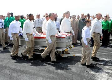 | Keywords: US Navy 090622-N-9988F-002 Chief petty officers assigned to Carrier Air Wing (CVW) 7 carry the casket of Command Master Chief Jeffrey J. Garber during a departure ceremony aboard the aircraft carrier USS Dwight D. Eisenhower (C.jpg en ARABIAN SEA June 22 2009 Chief petty officers assigned to Carrier Air Wing CVW 7 carry the casket of Command Master Chief Jeffrey J Garber during a departure ceremony aboard the aircraft carrier USS Dwight D Eisenhower CVN 69 Garber CVW-7 command master chief died June 20 of apparent natural causes while deployed aboard the aircraft carrier He was 43 The Eisenhower Carrier Strike Group is deployed to the U S 5th Fleet area of responsibility supporting operations Enduring Freedom and Iraqi Freedom as well as maritime security operations U S Navy photo by Mass Communication Specialist 2nd Class Rafael Figueroa Medina/Released 2009-06-22 090622-N-9988F-002 Navy http //www navy mil/view_image asp id 72995 U S Navy photo by Mass Communication Specialist 2nd Class Rafael Figueroa Medina PD-USGov-Military-Navy Flight deck of USS Dwight D Eisenhower CVN-69 |