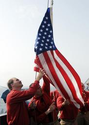| Keywords: US Navy 090623-N-3235P-029 Chief Aviation Ordnanceman Victor Almodovar, left, helps Chief Aviation Ordnanceman Mark Seals, raise a flag honoring John Finn, the oldest living Medal of Honor recipient.jpg en INDIAN OCEAN June 23 2009 Chief Aviation Ordnanceman Victor Almodovar left helps Chief Aviation Ordnanceman Mark Seals raise a flag honoring John Finn the oldest living Medal of Honor recipient aboard the aircraft carrier USS Dwight D Eisenhower CVN 69 The same flag will be hoisted on the mast of every U S carrier before it is given to Finn on his 100th birthday on July 23 The Eisenhower Carrier Strike Group is deployed to the U S 5th Fleet area of responsibility supporting operations Enduring Freedom and Iraqi Freedom as well as maritime security operations U S Navy photo by Mass Communication Specialist 3rd Class Nathan Parde/Released 2009-06-23 090623-N-3235P-029 Navy http //www navy mil/view_image asp id 73043 U S Navy photo by Mass Communication Specialist 3rd Class Nathan Parde PD-USGov-Military-Navy John William Finn Aviation Ordnanceman Aboard USS Dwight D Eisenhower CVN-69 Flag hoisting |