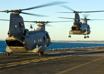 | Keywords: US Navy 090715-N-4010S-126 Two CH-46E Sea Knight helicopters assigned to Marine Medium Helicopter Squadron (HMM) 262 lift off from the amphibious assault ship USS Essex (LHD 2) to support amphibious operations.jpg en CORAL SEA July 15 2009 Two CH-46E Sea Knight helicopters assigned to Marine Medium Helicopter Squadron HMM 262 lift off from the amphibious assault ship USS Essex LHD 2 to support amphibious operations as part of Talisman Saber 2009 off the coast of Queensland Australia Talisman Saber 2009 is a joint exercise between the U S and the Australian Defense Force that includes participation from more than 20 000 U S and 10 000 Australian personnel U S Navy photo by Chief Mass Communication Specialist Ty Swartz/Released 2009-07-15 090715-N-4010S-126 Navy http //www navy mil/view_image asp id 73882 U S Navy photo by Chief Mass Communication Specialist Ty Swartz PD-USGov-Military-Navy Aboard USS Essex LHD-2 CH-46 US Marine Corps Talisman Sabre 2009 |