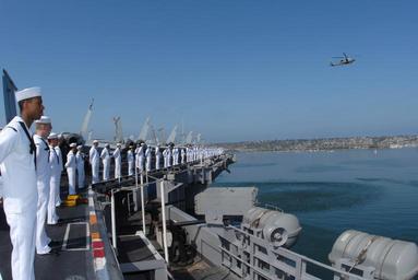 | Keywords: US Navy 090731-N-1786N-058 ailors aboard the aircraft carrier USS Nimitz (CVN 68) stand at parade rest while they man the rails.jpg en SAN DIEGO July 31 2009 Sailors aboard the aircraft carrier USS Nimitz CVN 68 stand at parade rest while they man the rails as an HH-60H Sea Hawk helicopter assigned to the Indians of Helicopter Anti-Submarine Squadron HS 6 hovers alongside Nimitz and embarked Carrier Air Wing CVW 11 are departing San Diego for a scheduled deployment to the western Pacific Ocean U S Navy photo by Mass Communication Specialist 2nd Class Bryan Niegel/Released 2009-07-31 090731-N-1786N-058 Navy http //www navy mil/view_image asp id 74685 U S Navy photo by Mass Communication Specialist 2nd Class Bryan Niegel PD-USGov-Military-Navy Naval ship departures from Naval Air Station North Island Aboard USS Nimitz CVN-68 Manning the rail in the United States Navy HH-60H Rescue Hawk |
