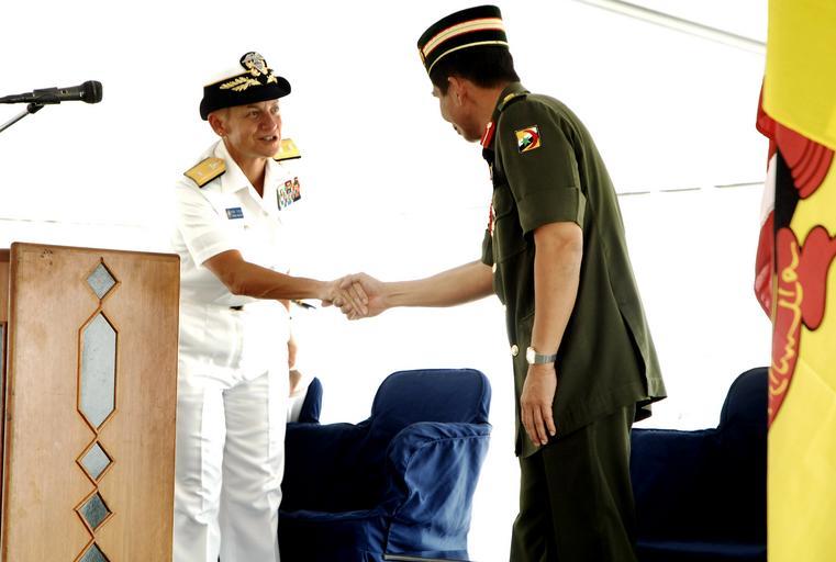 Keywords: US Navy 090810-N-2725D-119 Rear Adm. Nora Tyson, commander Logistics Group Western Pacific, extends her thanks to Col. Dato Rosli, joint forces commander, Royal Brunei Armed Forces.jpg en MUARA Brunei Aug 10 2009 Rear Adm Nora Tyson commander Logistics Group Western Pacific extends her thanks to Col Dato Rosli joint forces commander Royal Brunei Armed Forces aboard the landing ship USS Harpers Ferry LSD 49 during the closing ceremony for Cooperation Afloat Readiness and Training CARAT 2009 CARAT is a series of bilateral exercises held annually in Southeast Asia to strengthen relationships and enhance the operational readiness of the participating forces U S Navy photo by Mass Communication Specialist 2nd Class Nancy C diBenedetto/Released 2009-08-10 090810-N-2725D-119 Navy http //www navy mil/view_image asp id 75024 U S Navy photo by Mass Communication Specialist 2nd Class Nancy C diBenedetto PD-USGov-Military-Navy Images from US Navy location Muara Brunei Aboard USS Harpers Ferry LSD-49 Military of Brunei Nora Tyson Handshakes involving the military |
