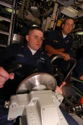 | Keywords: US Navy 090904-N-8119A-002 Yeoman 3rd Class Joshua Jones maintains the course and depth of the boat while standing helmsman of the watch as diving officer.jpg en BREMERTON Wash Sept 4 2009 Yeoman 3rd Class Joshua Jones maintains the course and depth of the boat while standing helmsman of the watch as diving officer of the watch Chief Fire Control Technician Troy Leonard looks on aboard the ballistic-missile submarine USS Henry M Jackson SSBN 730 U S Navy photo by Mass Communication Specialist 2nd Class Gretchen M Albrecht/Released 2009-09-04 090904-N-8119A-002 Navy http //www navy mil/view_image asp id 79357 U S Navy photo by Mass Communication Specialist 2nd Class Gretchen M Albrecht PD-USGov-Military-Navy USS Henry M Jackson SSBN-730 Yeoman United States Navy Submarine interiors |