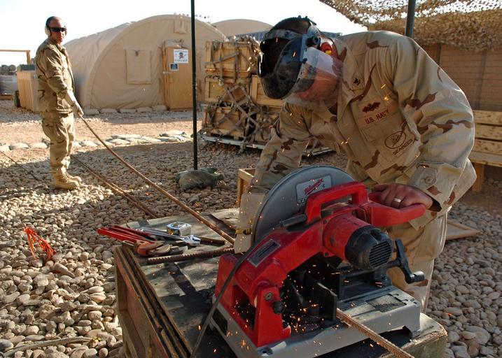Keywords: US Navy 090915-N-4440L-055 Builder 2nd Class Justin Pines and Construction Mechanic 2nd Class Charles Barrow cut steel rebar for a construction project.jpg en HELMAND PROVINCE Afghanistan Sept 15 2009 Builder 2nd Class Justin Pines and Construction Mechanic 2nd Class Charles Barrow both assigned to Naval Mobile Construction Battalion NMCB 74 cut steel rebar for a construction project NMCB-74 is deployed to Afghanistan supporting the NATO International Security Assistance Force and U S Forces-Afghanistan U S Navy photo by Mass Communication Specialist 2nd Class Michael Lindsey/Released 2009-09-15 090915-N-4440L-055 Navy http //www navy mil/view_image asp id 77109 U S Navy photo by Mass Communication Specialist 2nd Class Michael Lindsey PD-USGov-Military-Navy Helmand Province in the War in Afghanistan 2001-present Builder United States Navy Construction Mechanic United States Navy Rebar Miter saws |
