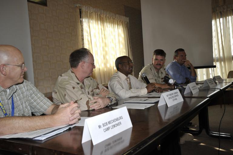 | Keywords: US Navy 091222-N-3417F-003 Said Omar Moussa, president of Djibouti's Chamber of Commerce, addresses an audience of Djiboutian businessmen and women during Combined Joint Task Force-Horn of Africa's Vendor Day.jpg en DJIBOUTI Dec 22 2009 Said Omar Moussa president of Djibouti's Chamber of Commerce addresses an audience of Djiboutian businessmen and women during Combined Joint Task Force-Horn of Africa's Vendor Day The event helped bridge African companies to the many maintenance service supply and construction contracts that support Camp Lemonnier CJTF-HOA and its down range projects throughout East Africa Seated with Moussa are from left to right Robert Mecklenburg contracting officer for Navy Facility Camp Lemonnier; U S Navy Capt Greg Johnson chief of contracts CJTF-HOA; Moussa; U S Navy Capt William Finn commander of Camp Lemonnier; and Bill Callahan deputy program manager Pacific Architect Engineers Camp Lemonnier U S Navy photo by Mass Communication Specialist 1st Class Larry Foos/released 2009-12-22 091222-N-3417F-003 Navy http //www navy mil/view_image asp id 79526 U S Navy photo by Mass Communication Specialist 1st Class Larry Foos PD-USGov-Military-Navy United States Navy images from Djibouti Sitting people |