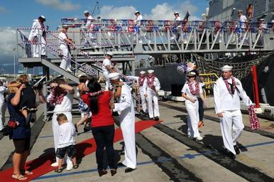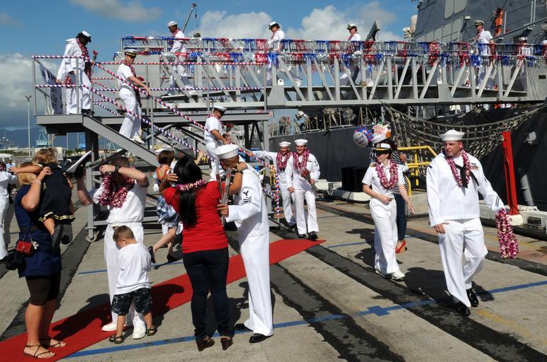 | Keywords: US Navy 100208-N-3666S-105 Sailors depart the guided-missile destroyer USS O'Kane (DDG 77) during the ship's homecoming to Joint Base Pearl Harbor.jpg en PEARL HARBOR Feb 8 2011 Sailors depart the guided-missile destroyer USS O'Kane DDG 77 during the ship's homecoming to Joint Base Pearl Harbor-Hickam after a seven-month deployment O'Kane was deployed as a part of Commander Task Force-Iraqi Maritime supporting maritime security cooperation efforts in the U S 5th Fleet area of responsibility U S Navy photo by Mass Communication Specialist 2nd Class Robert Stirrup/Released 2011-02-08 100208-N-3666S-105 Navy http //www navy mil/view_image asp id 97344 U S Navy photo by Mass Communication Specialist 2nd Class Robert Stirrup PD-USGov-Military-Navy Aboard USS O'Kane DDG-77 |