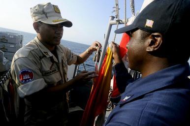 | Keywords: US Navy 100218-N-8335D-232 Quartermaster 3rd Class Jeremy Moore shows Lt. Chum Horn the man overboard Oscar flag aboard USS Patriot (MCM 7).jpg en GULF OF THAILAND Feb 18 2010 Quartermaster 3rd Class Jeremy Moore shows Lt Chum Horn of the Royal Cambodian navy the man overboard Oscar flag aboard the mine counter-measures ship USS Patriot MCM 7 Patriot is on a five-month deployment and is visiting Cambodia to conduct training and participate in a community-service project U S Navy photo by Mass Communication Specialist 1st Class Richard Doolin/Released 2010-02-18 100218-N-8335D-232 Navy http //www navy mil/view_image asp id 82096 U S Navy photo by Mass Communication Specialist 1st Class Richard Doolin PD-USGov-Military-Navy USS Patriot MCM-7 Quartermaster United States Navy |