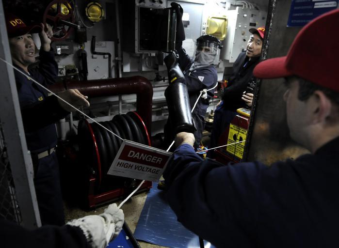 Keywords: US Navy 100311-N-7280V-204 Chief Electrician's Mate Mateo Canlas and Master Chief Electrician's Mate Ador Barcega direct Hull Maintenance Technician 3rd Class Alex Bonner and Electrician's Mate 3rd Class Gyanand Sookram during.jpg en PACIFIC OCEAN March 11 2010 Chief Electrician's Mate Mateo Canlas left and Master Chief Electrician's Mate Ador Barcega far right damage control training team DCTT members direct Hull Maintenance Technician 3rd Class Alex Bonner and Electrician's Mate 3rd Class Gyanand Sookram during a casualty power drill aboard the U S 7th Fleet command ship USS Blue Ridge LCC 19 Blue Ridge and U S 7th Fleet staff are underway in the Western Pacific Ocean for combined forces Exercise Key Resolve/Foal Eagle 2010 a routine peninsula-wide interoperability exercise involving all branches of the U S military and combined international forces U S Navy photo by Mass Communication Specialist 3rd Class Daniel Viramontes/Released 2010-03-11 100311-N-7280V-204 Navy http //www navy mil/view_image asp id 83057 U S Navy photo by Mass Communication Specialist 3rd Class Daniel Viramontes PD-USGov-Military-Navy Aboard USS Blue Ridge LCC-19 Electrician's Mate Hull Maintenance Technician United States Navy |