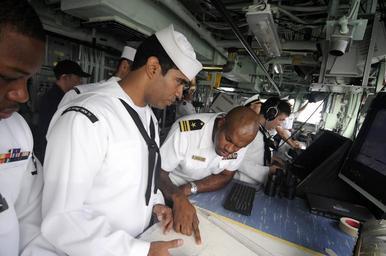 | Keywords: US Navy 100313-N-8335D-010 Lt. Cmdr. Patrick German, right, and Quartermaster 2nd Class David Mora plot the ship's position.jpg en CHITTAGONG Bangladesh March 13 2010 Lt Cmdr Patrick German right executive officer of the mine countermeasures ship USS Patriot MCM 7 and Quartermaster 2nd Class David Mora plot the ship's position on a chart as Patriot arrives in Chittagong Bangladesh for a port visit U S Navy photo by Mass Communication Specialist 1st Class Richard Doolin/Released 2010-03-13 100313-N-8335D-010 Navy http //www navy mil/view_image asp id 83175 U S Navy photo by Mass Communication Specialist 1st Class Richard Doolin PD-USGov-Military-Navy USS Patriot MCM-7 |