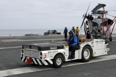 | Keywords: US Navy 100424-N-2821G-004 A tractor driver pulls a helicopter off the flight deck of the Nimitz-class aircraft carrier USS Abraham Lincoln (CVN 72).jpg en PACIFIC OCEAN April 24 2010 A tractor driver pulls a helicopter off the flight deck of the Nimitz-class aircraft carrier USS Abraham Lincoln CVN 72 to make room for MH-60R Sea Hawk helicopters assigned to Helicopter Maritime Strike Squadron HSM 77 Three of the squadron's helicopters arrived aboard the ship joining the HSM-77 crewmembers already aboard U S Navy photo by Mass Communication Specialist 2nd Class Alan Gragg/Released 2010-04-24 100424-N-2821G-004 Navy http //www navy mil/view_image asp id 84980 U S Navy photo by Mass Communication Specialist 2nd Class Alan Gragg PD-USGov-Military-Navy Aboard USS Abraham Lincoln CVN-72 Aircraft tugs aboard an aircraft carrier |
