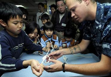 | Keywords: US Navy 100502-N-7280V-226 oatswain's Mate 3rd Class Jonis Birkes teaches boy and girl scouts how to tie traditional navy knots during a visit to USS Blue Ridge (LCC 19).jpg en HAKATA Japan May 2 2010 Boatswain's Mate 3rd Class Jonis Birkes a Sailor assigned to the U S 7th Fleet command ship USS Blue Ridge LCC 19 teaches boy and girl scouts how to tie traditional navy knots during a visit to the ship The visit included a tour of the ship hands-on firefighting demonstrations and traditional navy knots tying U S Navy photo by Mass Communication Specialist 3rd Class Daniel Viramontes/Released 2010-05-02 100502-N-7280V-226 Navy http //www navy mil/view_image asp id 85003 U S Navy photo by Mass Communication Specialist 3rd Class Daniel Viramontes PD-USGov-Military-Navy Aboard USS Blue Ridge LCC-19 Ropework |