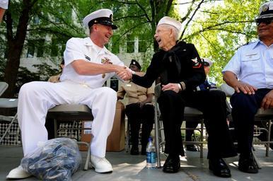 | Keywords: US Navy 100507-N-9818V-071 Master Chief Petty Officer of the Navy (MCPON) Rick West meets Con Crabb on the reviewing stand for the 61st Armed Forces Day Parade.jpg en CHATTANOOGA Tenn May 7 2010 Master Chief Petty Officer of the Navy MCPON Rick West meets Con Crabb on the reviewing stand for the 61st Armed Forces Day Parade Crabb was a radarman 3rd class during World War II West was Grand Marshall and Reviewing Officer for the parade U S Navy photo by Mass Communication Specialist 1st Class Jennifer A Villalovos/Released 2010-05-07 100507-N-9818V-071 Navy http //www navy mil/view_image asp id 85242 U S Navy photo by Mass Communication Specialist 1st Class Jennifer A Villalovos PD-USGov-Military-Navy Images from US Navy location CHATTANOOGA Tenn Rick D West |