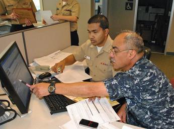 | Keywords: US Navy 100612-N-8374E-533 Chief Hospital Corpsman Hugo A. Castellanos, right, a Reserve Component member assigned to Operational Health Support Unit, Dallas, Detachment F.jpg en FORT WORTH Texas June 12 2010 Chief Hospital Corpsman Hugo A Castellanos right a Reserve Component member assigned to Operational Health Support Unit Dallas Detachment F works with Personnel Specialist 3rd Class Mukarram Hossain manpower clerk at Navy Operational Support Center Fort Worth as they review Castellano's Electronic Service Record ESR data in the Navy Standard Integrated Personnel System NSIPS Image edited for security purposes U S Navy photo by Senior Chief Mass Communication Specialist Maria R Escamilla/Released 2010-06-12 100612-N-8374E-533 Navy http //www navy mil/view_image asp id 87077 U S Navy photo by Senior Chief Mass Communication Specialist Maria R Escamilla PD-USGov-Military-Navy Naval Air Station Fort Worth Hospital Corpsman People using computers in the 2010s |