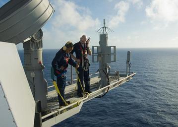 | Keywords: US Navy 100626-N-4830B-077 Sailors ommunicate with a safety observer as they perform maintenance on the OE-82 antenna on the yardarm aboard the aircraft carrier USS George Washington (CVN 73).jpg en PACIFIC OCEAN June 26 2010 Electronics Technician 3rd Class Antonia Williams from Lagrange Ga and Electronics Technician 2nd Class Michael Milan from Seattle communicate with a safety observer as they perform maintenance on the OE-82 antenna on the yardarm aboard the aircraft carrier USS George Washington CVN 73 The radar systems are located at the top of the ship's mast 218 feet above the waterline and can only be reached by climbing aloft George Washington the Navy's only permanently forward-deployed aircraft carrier is underway supporting security and stability in the western Pacific Ocean U S Navy photo by Mass Communication Specialist 3rd Class Danielle A Brandt/Released 2010-06-26 100626-N-4830B-077 Navy http //www navy mil/view_image asp id 87745 U S Navy photo by Mass Communication Specialist 3rd Class Danielle A Brandt PD-USGov-Military-Navy Aboard USS George Washington CVN-73 |