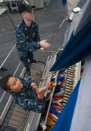 | Keywords: US Navy 100701-N-5319A-026 Ensigns Jessica Alabata and Andrew Norris take turns raising signal flags during flag signaling drills.jpg en PACIFIC OCEAN July 1 2010 Ensigns Jessica Alabata and Andrew Norris take turns raising signal flags during flag signaling drills between the amphibious transport dock ship USS New Orleans LPD 18 and the guided-missile frigate USS Klakring FFG 42 while deployed supporting Southern Partnership Station 2010 New Orleans is participating in Southern Partnership Station an annual deployment of U S military training teams to the U S Southern Command area of responsibility U S Navy photo by Mass Communication Specialist 1st Class Brien Aho/Released 2010-07-01 100701-N-5319A-026 Navy http //www navy mil/view_image asp id 88139 U S Navy photo by Mass Communication Specialist 1st Class Brien Aho PD-USGov-Military-Navy Aboard USS New Orleans LPD-18 Southern Partnership Station 2010 |