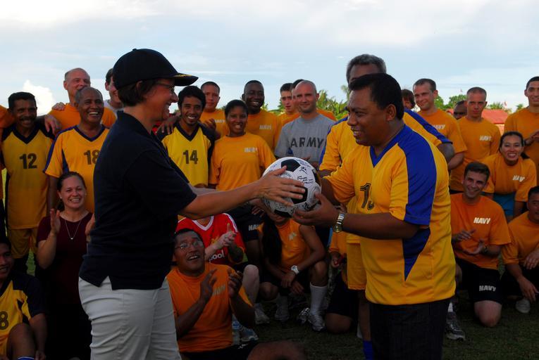 Keywords: US Navy 100715-N-4044H-571 Capt. Lisa M. Franchetti gives an Indonesian soccer team representative a signed soccer ball following a soccer match between host nation Indonesians and Sailors.jpg en TOBELO Indonesia July 15 2010 Capt Lisa M Franchetti commander of Pacific Partnership 2010 gives an Indonesian soccer team representative a signed soccer ball following a soccer match between host nation Indonesians and Sailors during a community service event in Tobelo Indonesia The Military Sealift Command hospital ship USNS Mercy T-AH 19 is in the North Maluku Islands participating in Pacific Partnership 2010 the fifth in a series of annual U S Pacific Fleet endeavors conducted in Indonesia as a disaster relief exercise aimed at strengthening regional partnerships U S Navy photo by Mass Communication Specialist 2nd Class Eddie Harrison/Released 2010-07-15 100715-N-4044H-571 Navy http //www navy mil/view_image asp id 89040 U S Navy photo by Mass Communication Specialist 2nd Class Eddie Harrison PD-USGov-Military-Navy Aboard USNS Mercy T-AH-19 Lisa M Franchetti |