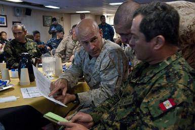 | Keywords: US Navy 100717-N-5319A-019 Col. Gary Johnsto and Peruvian Col. Gerardo Gervasi discuss details during a confirmation brief in the wardroom of USS New Orleans (LPD 18).jpg en PACIFIC OCEAN July 17 2010 Col Gary Johnston commanding officer of Special Purpose Marine Air Ground Task Force SPMAGRTF 24 and Peruvian Col Gerardo Gervasi discuss details during a confirmation brief in the wardroom of the amphibious transport dock ship USS New Orleans LPD 18 about upcoming multinational joint exercises off the coast of Peru during Southern Partnership Station 2010 New Orleans is participating in Southern Partnership Station an annual deployment of U S military training teams to the U S Southern Command area of responsibility U S Navy photo by Mass Communication Specialist 1st Class Brien Aho/Released 2010-07-17 100717-N-5319A-019 Navy http //www navy mil/view_image asp id 88920 U S Navy photo by Mass Communication Specialist 1st Class Brien Aho PD-USGov-Military-Navy Aboard USS New Orleans LPD-18 Southern Partnership Station 2010 Military exercises of Peru Wardrooms on United States ships |