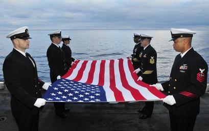 | Keywords: US Navy 100721-N-3595W-006 Sailors prepare to fold the national ensign during a sunrise burial at sea aboard USS Dwight D. Eisenhower (CVN 69).jpg en ATLANTIC OCEAN July 21 2010 Sailors assigned to the aircraft carrier USS Dwight D Eisenhower CVN 69 prepare to fold the national ensign during a sunrise burial at sea The Eisenhower Carrier Strike Group is deployed as part of an-ongoing rotation of forward-deployed forces to support maritime security operations in the U S 5th and 6th Fleet areas of responsibility U S Navy photo by Mass Communication Specialist 2nd Class Gina K Wollman/Released 2010-07-21 100721-N-3595W-006 Navy http //www navy mil/view_image asp id 89160 U S Navy photo by Mass Communication Specialist 2nd Class Gina K Wollman PD-USGov-Military-Navy Aboard USS Dwight D Eisenhower CVN-69 Sea burials |